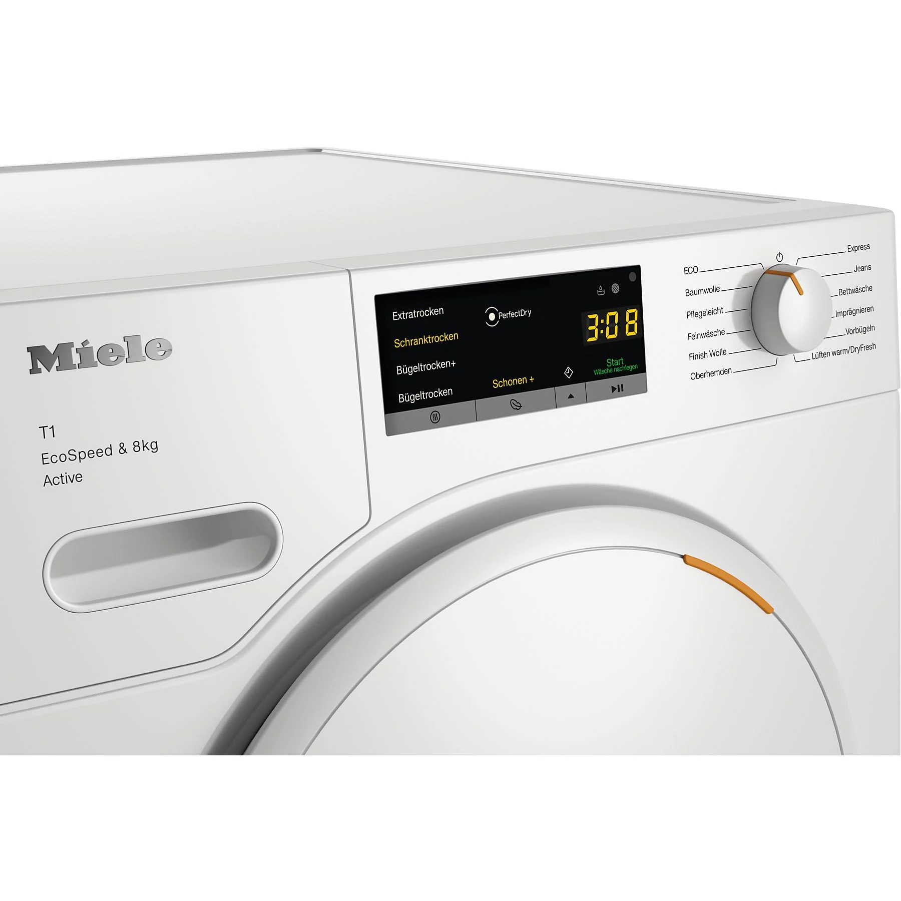 Programma Cotone, Biancheria da letto – Asciugatura uniforme di tessuti di grandi dimensioni. ECO, Express – Asciugatura rapida di piccoli carichi. Delicato, Finish Lana – Cura delicata dei tessuti sensibili. Impregnante – Funzione idrorepellente ottimale. Jeans, Asciugatura a caldo/DryFresh, Camicie, Facile da lavare, Prestiratura.